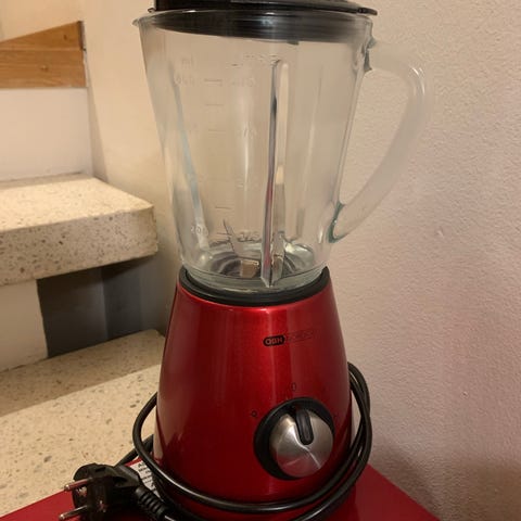 Tehosekoitin varaosiksi. Lasikulho on samentunut. Kone toimii, mutta terä on ilmeisesti tylsä, kun toimii huonosti. Näyttäisi olevan ruostetta tossa osassa, joka tulee moottoriin kiinni (viimeinen kuva). Virtakytkimen numerot kuluneet.