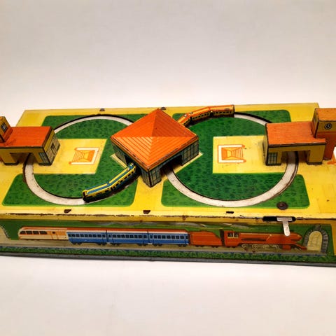 Kaupan kuvan peltilelut. Junarata oletettavasti Neuvostoliitossa 1960/70-luvun taitteessa tehty jousikoneistolla toimiva lelu. Mitat ovat noin 24*12*7 cm. Yleisilmeeltään siisti, vetoavain hukkunut. Käytön jälkiä toki löytyy ja koneisto kaipaa kenties herkistämistä.