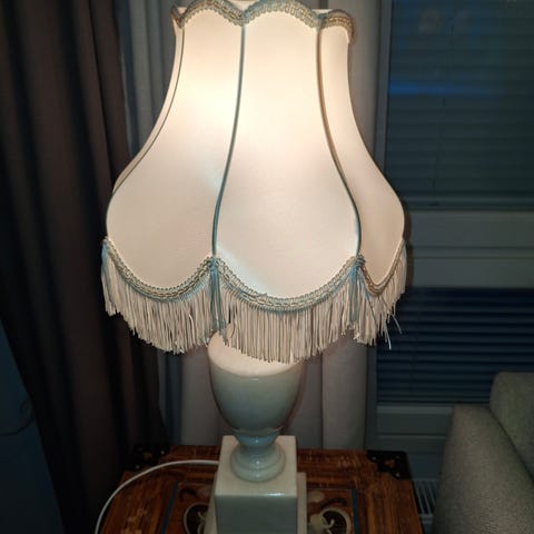 Vintage valaisin, teak varsi, luonnonvalkoinen/ kullanvärinen vekattu varjostin, korkeus 55cm ja verkostomenetelmät koko 22x22cm, 35€ (maadottamaton pistoke)