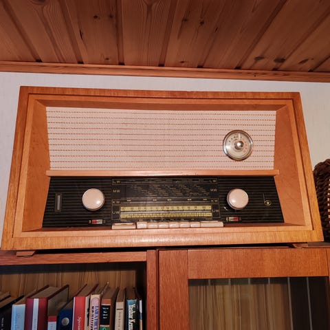Vanha radio, jonka toimivuutta ei ole testattu. Ollut vuosikymmeniä koristeena.
