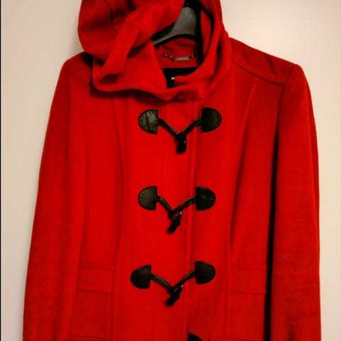 Tumman vihreä, hupullinen Duffeli, jossa hupun reunassa kaunis karva reunus. Takin pituus 120 cm ja käden pituus 65 cm. Hupun voi irrottaa, on napeilla kiinni. Takin sisäpuolella on vetoketjullinen tasku.