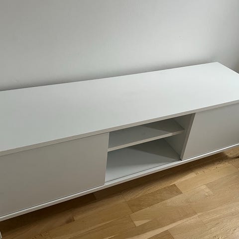 IKEA valkoinen TV-taso, jossa liukuovet. Huonekalu on valmistettu valkoisesta materiaalista ja soveltuu esimerkiksi olohuoneen viihdekeskukseksi tai säilytystilaksi.