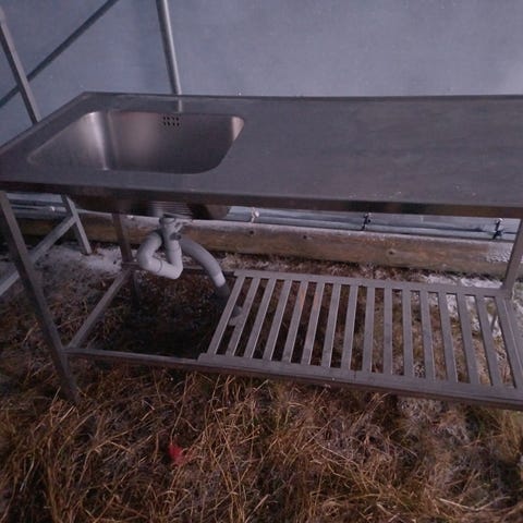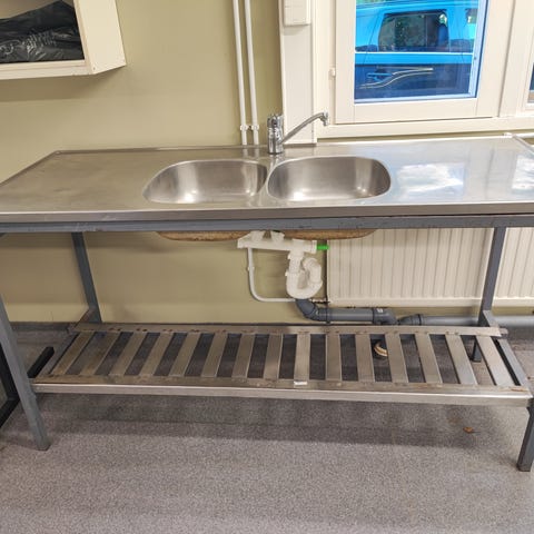 Tiskipöytä altaalla. Seinään kiinnitettävä. Mitat 165 cm x 62 cm. Allas 40 x 50 x 20 cm.