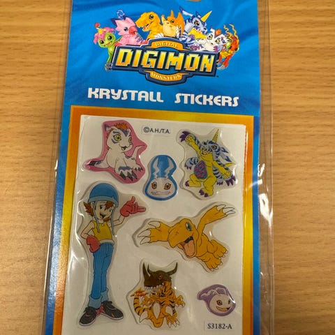 Kaksi arvaamatonta Digimon -tarrapakkausta.