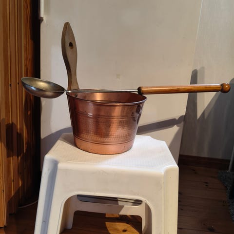 Hakusanat: löyly kauha saunakauha sauna kauha metalli kupari messinki puu puinen puuvarsi vintage retro vesikauha vesi kauha muovikauha muovi kauha plastex takorauta