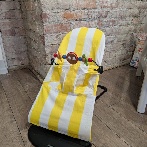Ehjä Babybjörn sitteri, johon tehty itse marimekko kuosilla oleva päällinen.