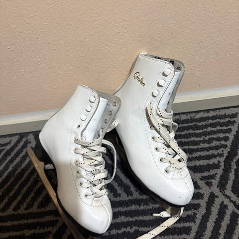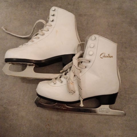 Kuvanmukaiset luistimet. Käytön jälkeä kärjissä. Kangas ehkä aavistuksen tummunut, en ole pyyhkinyt. Terissä ei ruostetta.
