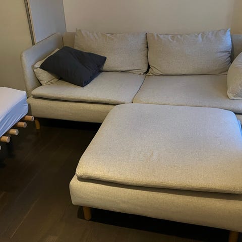 Söderhamn sohva, kolme erillistä palaa, kaksi kulmapalaa ja yksi keskipala. Mukaan tulee viisi isoa selkänojatyynyä, sekä neljä pientä tyynyä.