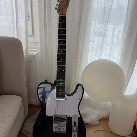 Squier Telecaster sähkökitarat, keltainen runko ja vaahterakaula. Sähkökitarassa on perinteinen Telecaster-malli ja se on tarkoitettu kitaransoitosta kiinnostuneille käyttäjille. Sisältää Harley Benton vahvistimen. Molemmat sekä kitara, että vahvistin toimii. Vaatii ehkä vaihtamaan yhden kielen kitarasta.