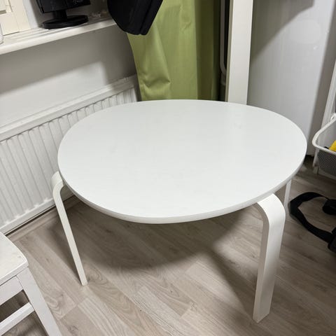 IKEA sohvapöytä, jossa valkoinen pyöreä kansi ja metallinen valkoinen runko. Pöytä soveltuu esimerkiksi olohuoneeseen tai muuhun oleskelutilaan.