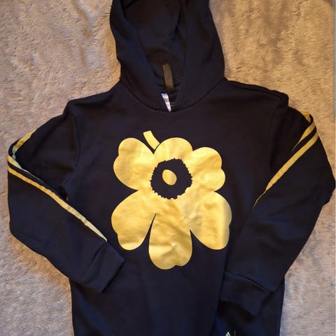 Marimekko x Adidas huppari koossa 164 (menee myös xs-s-kokoiselle aikuiselle). Printissä kultainen unikko. Paristi käytetty, kertaalleen taidettu pestä. Koiratalous.