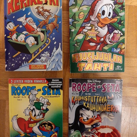 Kuvan akkarit, roopesedät, muutama kovakantinen, edullisesti seuraavalle ankkafanille. Koko kasa 15e. Noudettuna 10e