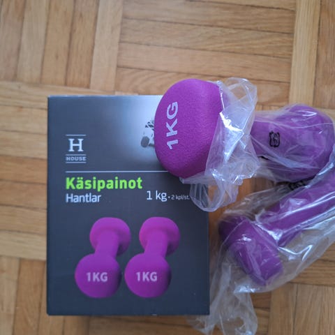 Käsipainot, 2 kappaletta, väriltään punainen ja musta. Käytettyjä kuntoisia käsipainoja, joissa on pyöreät painot ja suora kahva.