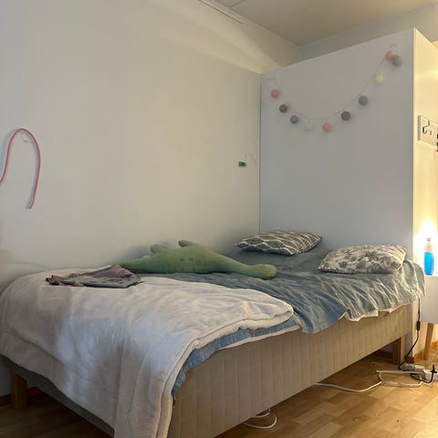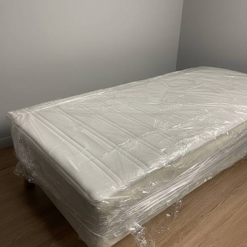 IKEA Skarer sänky, jossa on vaalea patjan päällinen ja harmaa runko. Sänky soveltuu makuuhuoneeseen ja tarjoaa perustason nukkumapaikan.