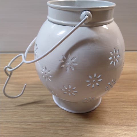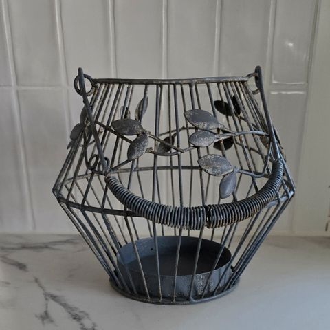 Tummanpunainen metallinen lyhty. Korkeus 26 cm, syvyys ja leveys 13 cm.