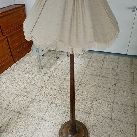 Ehjä ja siistiluntoinen kahden valopisteen lattiavalaisin, SLO:n Vuokko. Varjostimet valkoiseksi maalattua metallia, jalka messinkiä.