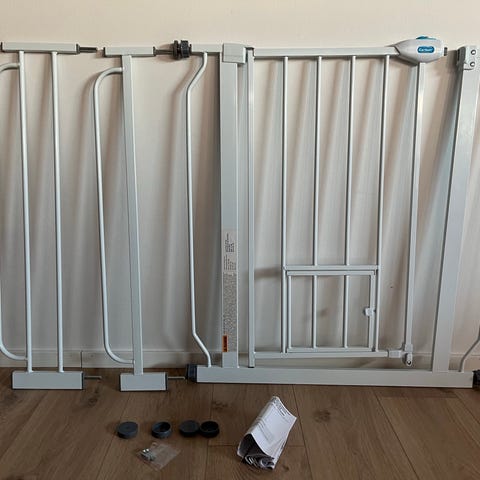 Carlson Walk-Through Gate. Korkea koiraportti. Alkuperäisessä pakkauksessaan. Ohjekirjat sekä nippelit ja nappelit mukana. Kissa pääsee näppärästi kulkemaan omasta pikku ovestaan. Ei vaadi poraamista. Ovi kiinnitetään kierrettävillä ruuveilla, karmia vasten tulee muovinen kiinnike.