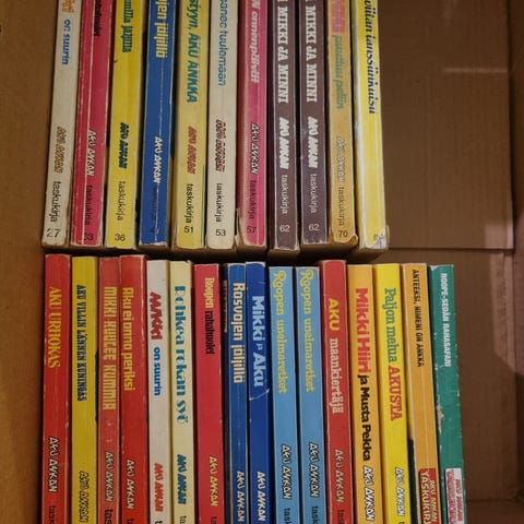 Laatikollinen Aku Ankan taskukirjoja. Suurin osa hyvässä kunnossa.