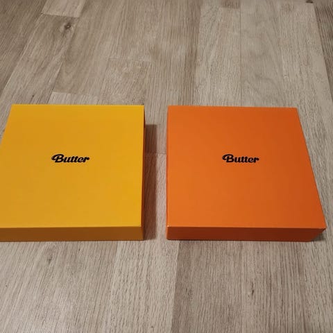 BTS Butter CD-levy oranssissa pakkauksessa. Sisältää CD-levyn ja mukana tulevat kansilehtiöt, kotelon ja kuvakortin.