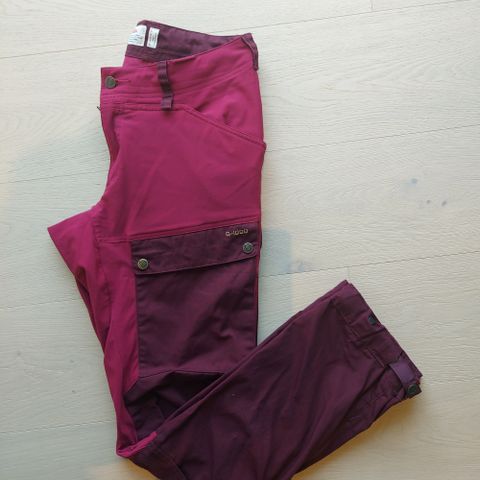 Fjällräven Keb naisten housut, koko 38. Housuissa on kestävä materiaali ja useita taskuja, jotka sopivat ulkoiluun ja retkeilyyn. Väri on punainen ja tummanpunainen.