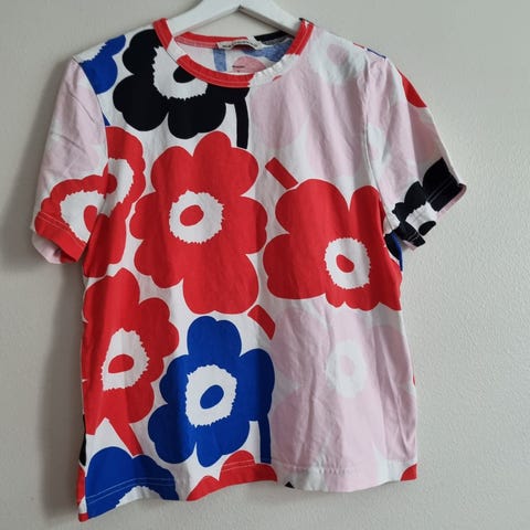Marimekon musta t-paita vaaleanpunaisilla glitter yksityiskohdilla. Koko S, kai-kai noin 50cm, relaxed fit. Materiaali 100% puuvillaa, kangas joustaa.