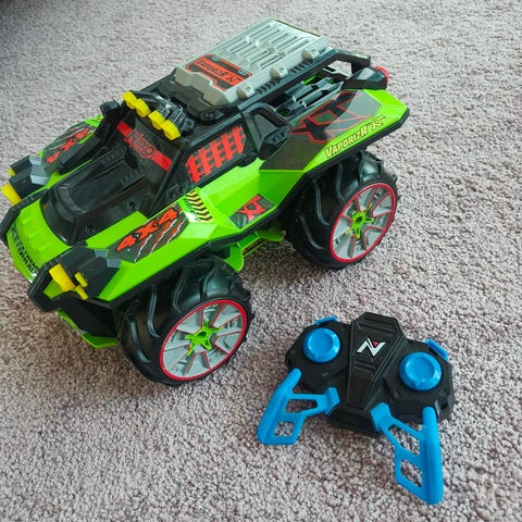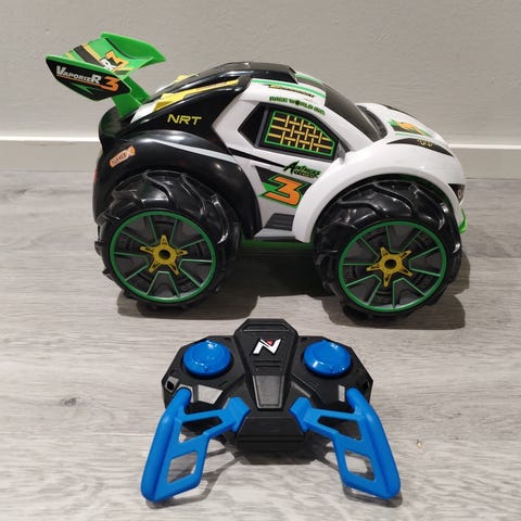 Sinivalkoinen väri. Radiolla ohjattava lasten leluauto. Kulkee myös vedessä, ilmatäytteiset renkaat.Mukana ohjain ja latauslaite. Ehjä ja toimiva. Ohjaimeen menee 9V ns. neppariparisto ja autossa on akku, jota ladataan mukana tulevalla laturilla. Laturi toimii verkkovirralla