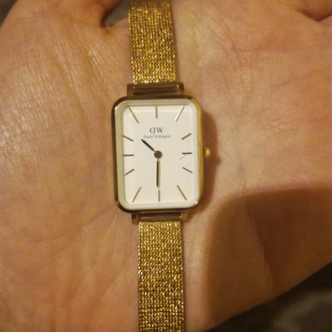 Vähäisessä käytössä ollut aito Daniel Wellingtonin naisten kello. Punakullattua terästä, valkoinen kangasranneke. Ranneke on pesty ja siistissä kunnossa. Saa siis otettua helposti pois. Alkuperäistä koteloa/pussia ei enää jäljellä.
