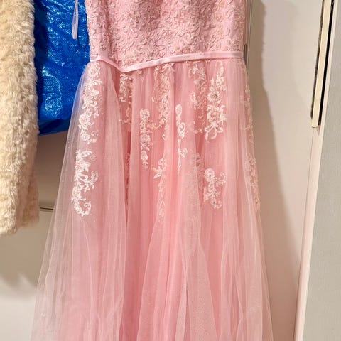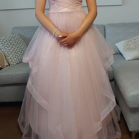 Uutena ostettu ja yhdet tanssit tanssittu vanhojentanssimekko. Koko M. Tyllihelma kimalluksella ja strassikoristelu yläosassa. Käy vannealushameen kanssa tai ilman sitä. Vannealushame mukaan.