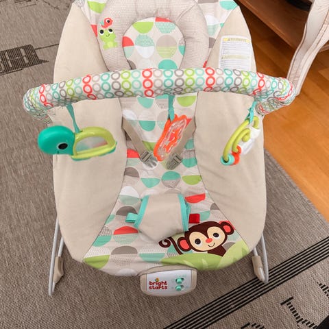 Doomoo vauvan säkkituolimainen sitteri. Lisäksi tulee alusta millä saa keinutettua säkkituolia sekä puuvarsi johon voi ripustaa leluja.