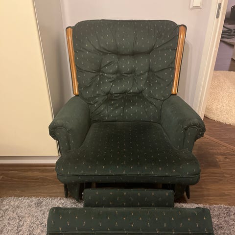 Käytetty korkeaselkäinen lepotuoli lehtikuviollisella kankaalla. Kiinteä verhoilu, istuintyyny irrallinen. Empak valmistama.