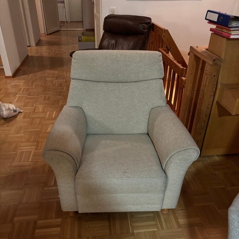 Tuolin kangas kulunut käsinojien ja selkänojan kohdalta.