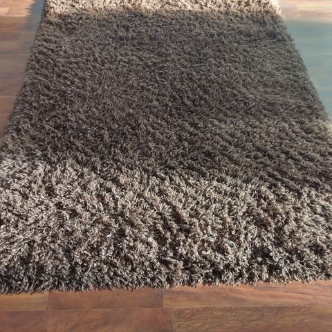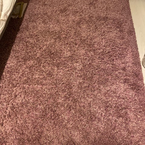 Jo pidempään käytössä ollut luonnonvalkoinen nukkamatto salmiakkikuviolla.