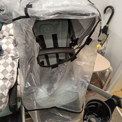 Valmistettu 100 % polyesteristä ja EVA-muovista. Suoja suojaa lasta sateelta, tuulelta ja lumelta. Hyvässä kunnossa, ehjä. En pese ennen myyntiä. Erittäin hyväkuntoinen siis, mutta pesussa lähtevää likaa saattaa löytyä, en syynännyt tuotetta.