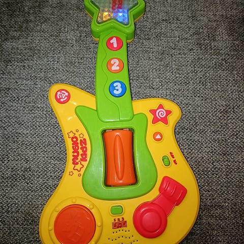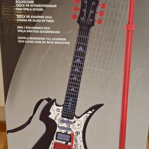 ToyRock kitara ja mikki jalustalla. Patterit juuri vaihdettu kitaraan, toimii. Mikin saa yhdistettyä kitaraan, kohtuullisesti toimii mikistäkin ääni.