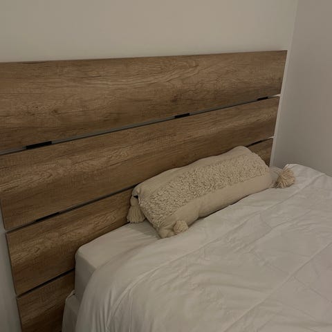160cm sängylle pääty. Sivuissa lokerot. Meillä on ollut vaan sängyn ja seinän välissä. Päädyn keskellä vähän irronnut pintaa (3) kuva, saa vaikka liimalla painettua takaisin kiinni. Laitettu päätyyn pehmustetarrat kun on seinää vasten ja siinä myös johdoille kaksi koloa. Haku Turku, Iso-Heikkilä.