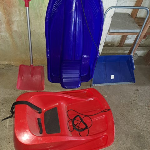 Kolme ehjää pulkkaa, vähän pölyä päällä. Stigan rattikelkka josta on suksi haljennut (varaosiksi tai korjaukseen).