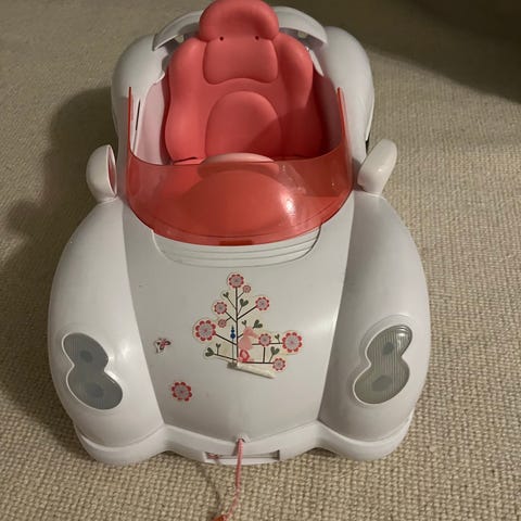 Baby Born nuken kantokoppa sisältäen kantokahvan, istuinkankaan (joka vaatii korjausta, mutta sillä voi kyllä leikkiä) ja turvavyön. Mukana myös erilaisia leikkitarvikkeita kuten tuttipullo, tutti, potta ja muita pieniä leluja. Värit pääasiassa sininen, punainen ja vaaleanpunainen. Soveltuu lasten leikkeihin ja roolipeleihin.