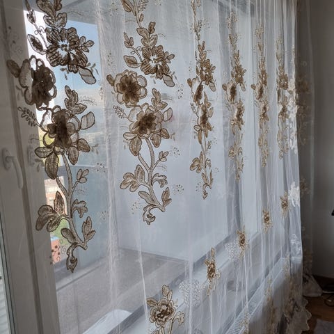 Kaksi Eurokankaan ompelemaa kolme vuotta käytössä ollutta verhoa, pituus 258cm