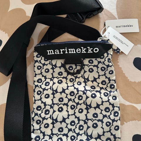 Marimekko kangas olkalaukku naisille. Laukku on valmistettu kestävästä puuvillakankaasta ja siinä on metalliset kulmasuojat.