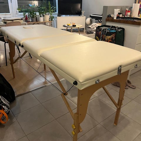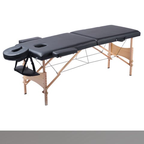 Taitettava hierontapöytä mustalla pinnalla. Pöytä on suunniteltu helppoon kuljetukseen ja säilytykseen taitettavan rakenteensa ansiosta.