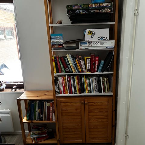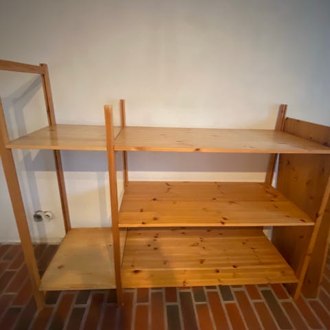Perinteinen Lundia hylly puun värisenä. Hyllylevyjen paikat on säädettävissä ja niitä on yhteensä 7 kappaletta.