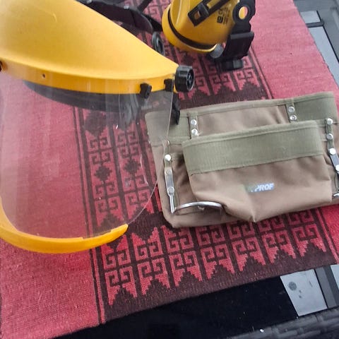 Sahoja, erinäisiä sähkötarvikkeita+ tukeva työmaa/ huomiotolppa.