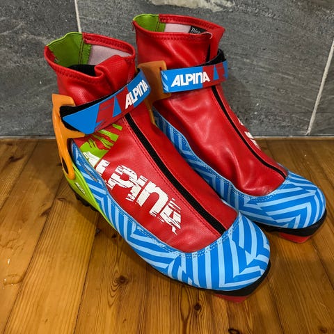 Alpina RCL hiihtomonopunaisena. Sisäkengässä nauhoitus ja pinnassa vetoketju. Hengittää hyvin ja suojaa kosteudelta. Ulkosyrjissä pientä kulumaa. Koko 40