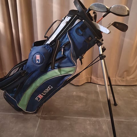 Aloittelijalle setti edullisesti. Bägi, putteri, raudat S,P, 6-9, ja kolme isompaa mailaa.
