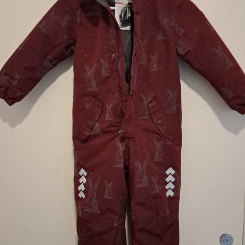 Lasten toppahaalari, koossa 116cm. Musta tähtikuvioilla. Lämmin puku. Huppu nepparikiinnityksellä, samoin hupun karvareunus. Pepussa hieman karheumaa, vasemmassa polvessa pieni paikka. Hihat ja lahkeensuut ehjät. Jalkalenksut Molon puvusta.