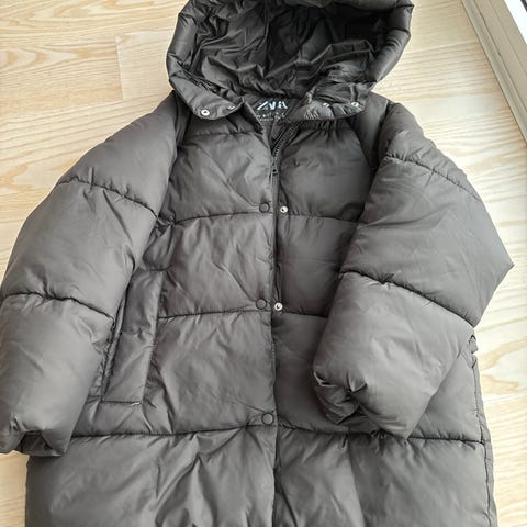 Lasten Zara toppatakki, koko 140 cm, harmaan värinen, valmistettu polyesteristä. Takki on varustettu hupulla ja vetoketjulla.