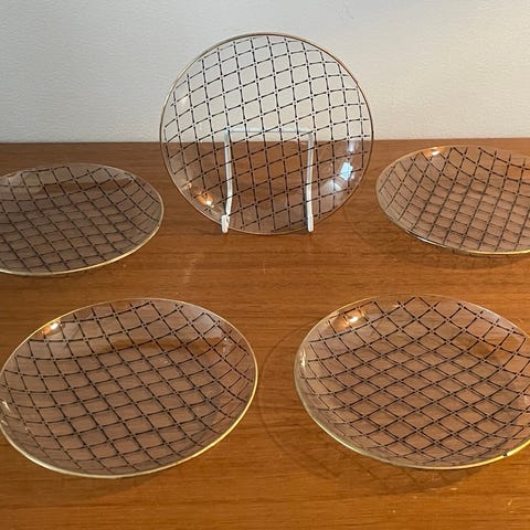 11 kpl lasisia kultareunaisia lautasia. Halkaisija 13cm. Google kuvahaun mukaan: