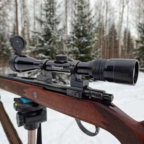 Shirstone made in Japan 3-9x40 kiikari, valaistu ristikko (4) seitsemällä kirkkausasteella, tuuman runkoputki, naarmuttomat linssit ja toimivat säädöt, joitain käytön jälkiä, mutta yleisilme kohtuu siisti. Kiikari 60 €, Optilock matalat renkaat 40 €, yhteensä 90 €