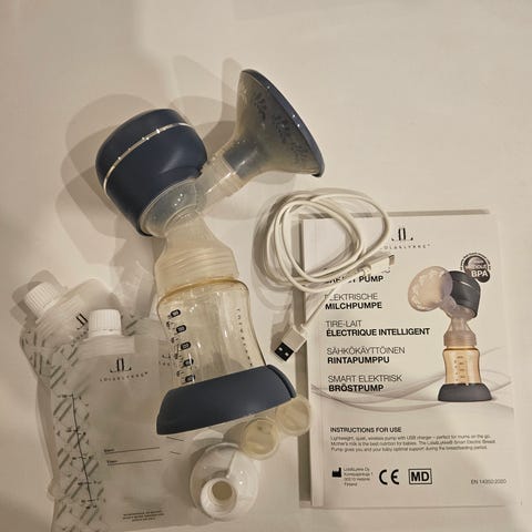 Lykke rintapumppu ja kuvassa näkyvät osat mukaan. Tuttipäitä, ylimääräinen tuttipullo, 24mm suppilo, säilytyspussi ja varaosia. Suoraan käytöstä, osat aina tiskattu ja keitetty ennen ja jälkeen käytön. Mukaan saa halutessaan liiveihin laitettavat maidonkerääjät ja mamin muutaman kerran käytetyn koottavan tuttipullon. Laturipiuhaa en löytänyt mutta tähän käy normaali micro-USB laturi. Toimii ja akku kestänyt hyvin. Nouto lpr keskusta tai toridiili.