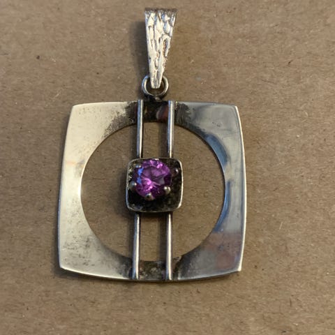 Einar Keilanin valmistama pieni hopeariipus, jossa sininen korukivi. Riipuksen koko 0.8 cm x 1.5 cm. Leimat EK, 830. Ketjun pituus 42 cm, leima 925.
